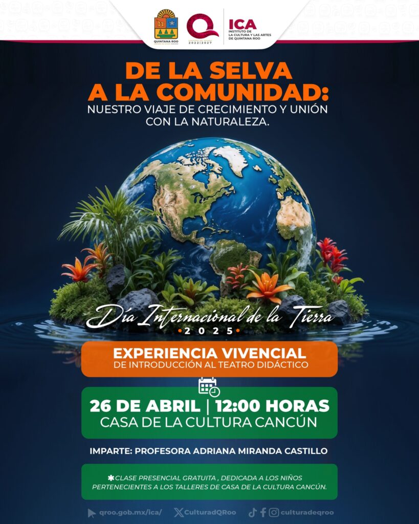 En este emocionante espacio de sesiones presenciales de artes escénicas y sustentabilidad digital y medio ambiental, creado en colaboración con la Casa de la Cultura de Cancún, nos enorgullece presentar un evento especial diseñado para la infancia y la juventud quintanarroense, de México y de todo, nuestros agentes de cambio del futuro. ¡Prepárense para vivir un Día Internacional de la Madre Tierra lleno de creatividad y aprendizaje!